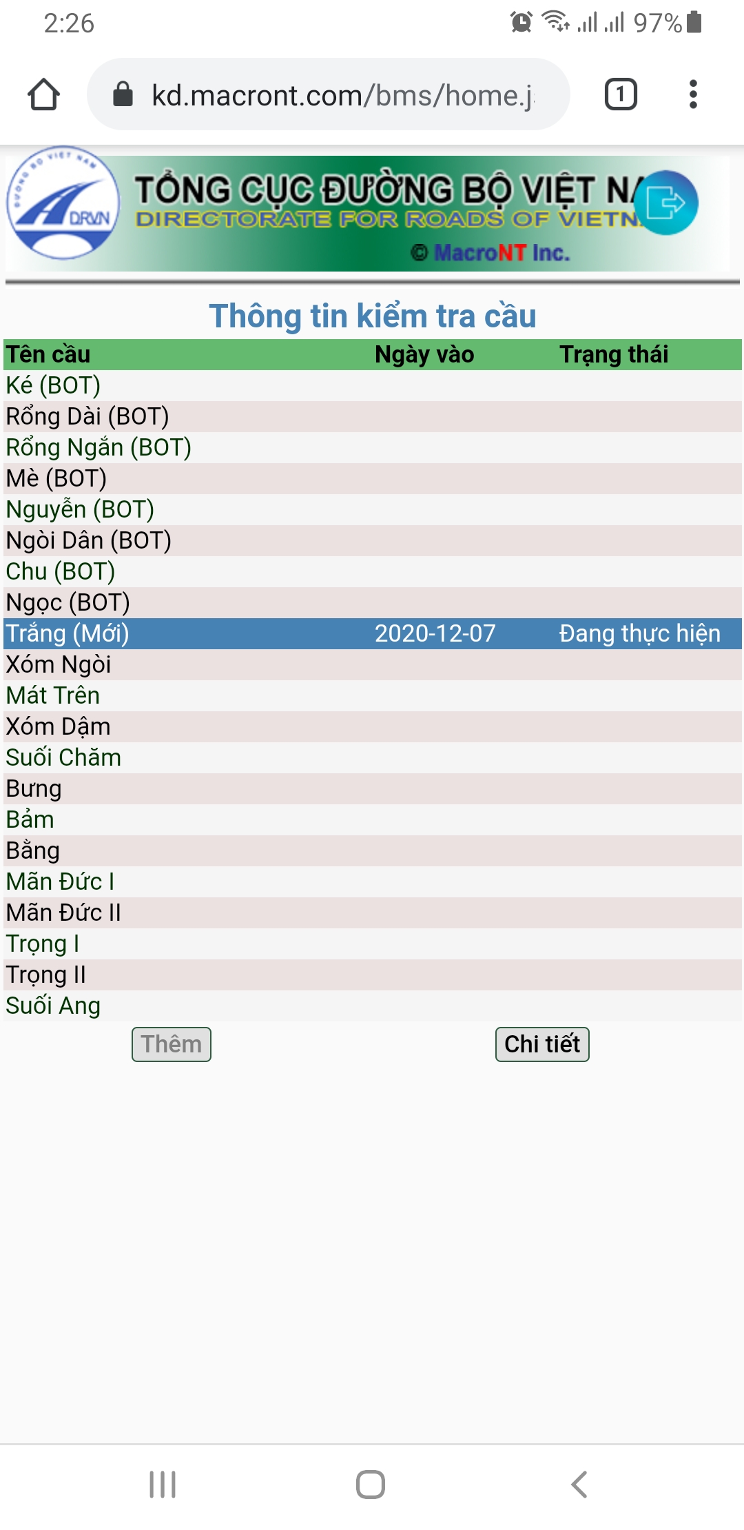 Tại mỗi dòng, sẽ có thông tin về lần kiểm tra cuối cùng đối với từng cầu cùng với trạng thái của lần kiểm tra đó. Mỗi cầu tại một thời điểm chỉ có thể 1 lần kiểm tra ở trạng thái mở (nháp)